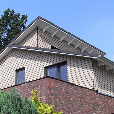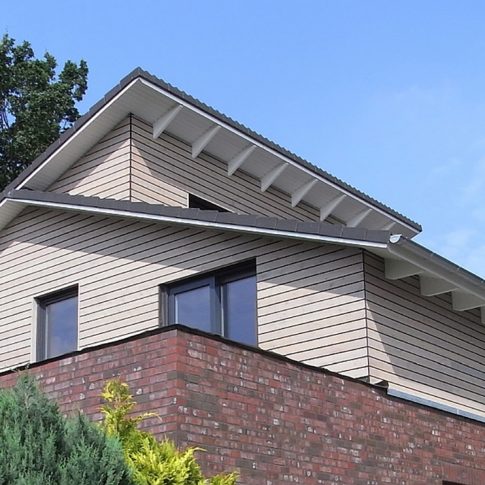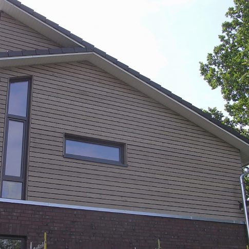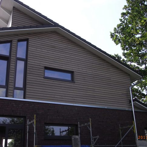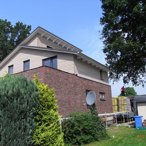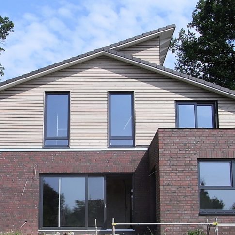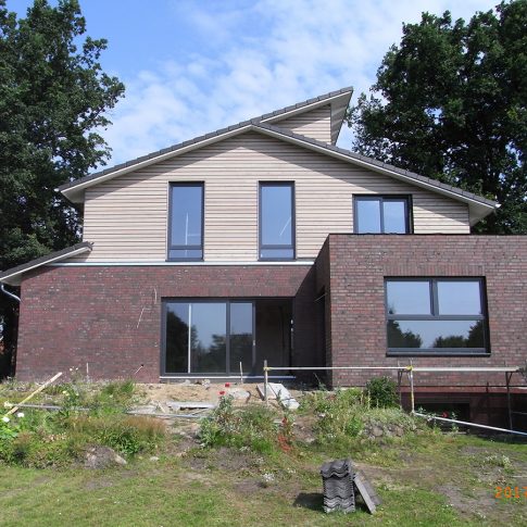 Nach Abbruch des Altbaus bis zur Kellerdecke, wurde ein modernes Architektenhaus mit Pultdach aufgebaut. Es wurde besonderer Wert auf großzügige Fensterflächen zur Gartenseite gelegt, sowie auf einen offenen Wohn-, Ess- und Küchenbereich gelegt.